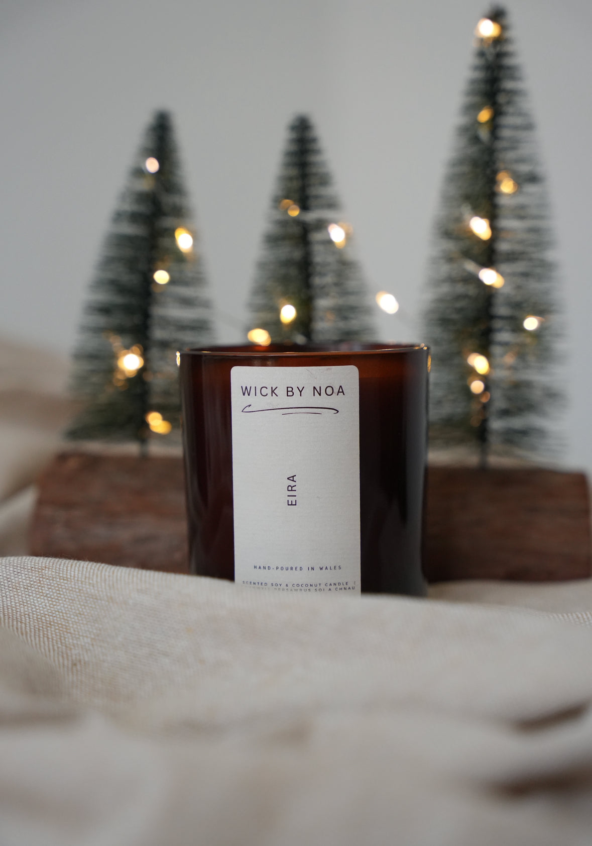 Eira is crafted from a blend of soy and coconut wax, delivering a sophisticated winter fragrance. Its top notes of cinnamon pair beautifully with warm clove and a zesty orange base, creating a layered scent that fills living rooms with festive warmth. Perfect for adding a celebratory touch to dining areas or a cosy ambiance to bedrooms, Eira brings indulgence and joy to your home throughout the holiday season.