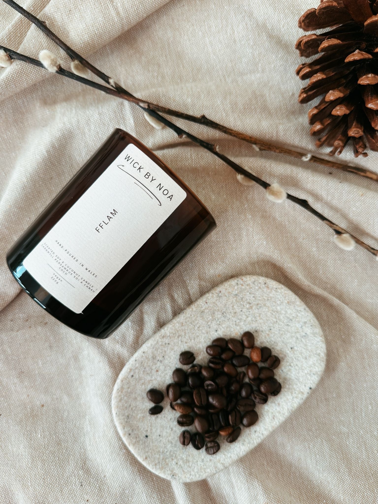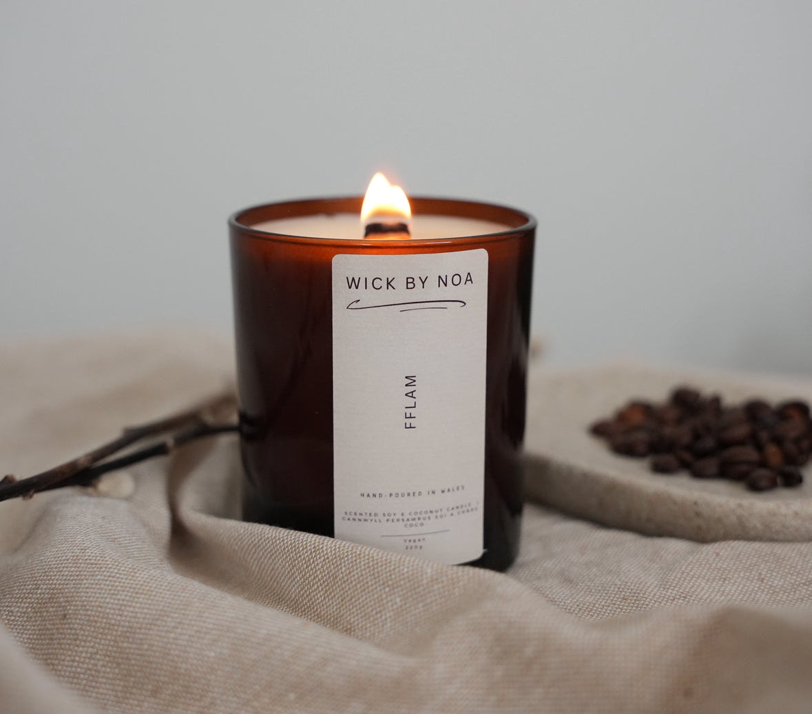 Mae Fflam yn ganwyll wedi’i dywallt â llaw o wac soi a chnau coco sy’n dal swyn anhygoel Black Opium. Mae nodau brig disglair o bupur pinc a blodau oren yn deffro’r synhwyrau, tra bod calon o jasmin a choffi yn ychwanegu dyfnder a dirgelwch. Mae’r persawr yn setlo i sylfaen gynnes a synhwyrus o fanila a phatchouli, gan greu arogl dewr, agosach - perffaith ar gyfer pob tymor ac i greu awyrgylch soffistigedig a deniadol.